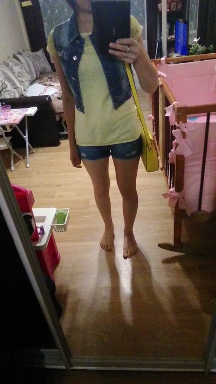 Первый вариант похож на пижамку) попробуйте шорты с однотонной майкой может? Жилетка клевая😉