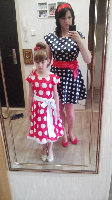 Если решили идти в платье, то снимите ободок, впрочем об этом писали. Оставьте пояс и балетки. Пояс другого цвета есть или нет? Если нет, то в этом. Красного много, с другой стороны без пояса не айс. Задумка отличная, не моя длина платья, ябы наоборот дочке покороче, себе подлиннее. Но это я . Главное, чтобы вам было комфортно.