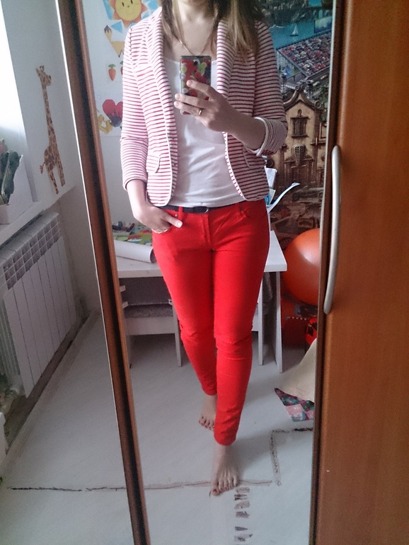 ПосоветуйтеВобщем как я писала, я сижу пока в декрете. И конечно практически не вылезаю из джинс. Но вот лежат у меня красные штанцы под джинсы и вот не знаю, обыгрывать их как-то или не носить? И брюки коричневые?