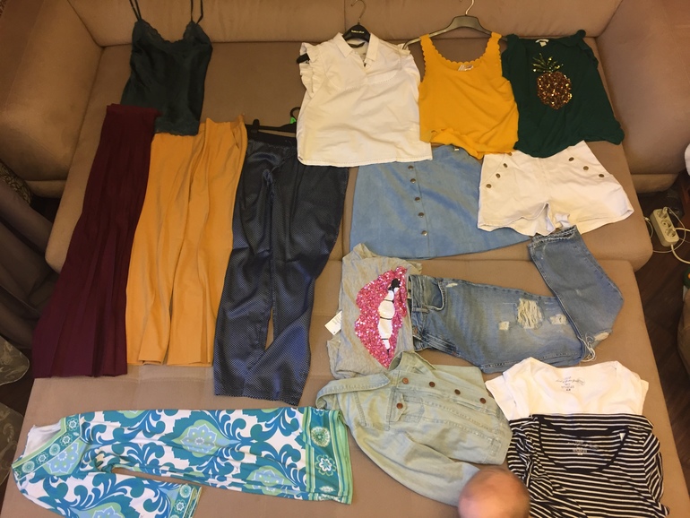 Две пары летних брюк, длинная юбка, короткая юбка (она вызывает вопросу у меня, но может на море нормально будет), джинсы и две пары шорт. Две майки ХБ, две майки с пайетками, две блузки и одна майки в бельевом стиле. Платье. Джинсовка. Все практически между собой комбинируется, сочетается.