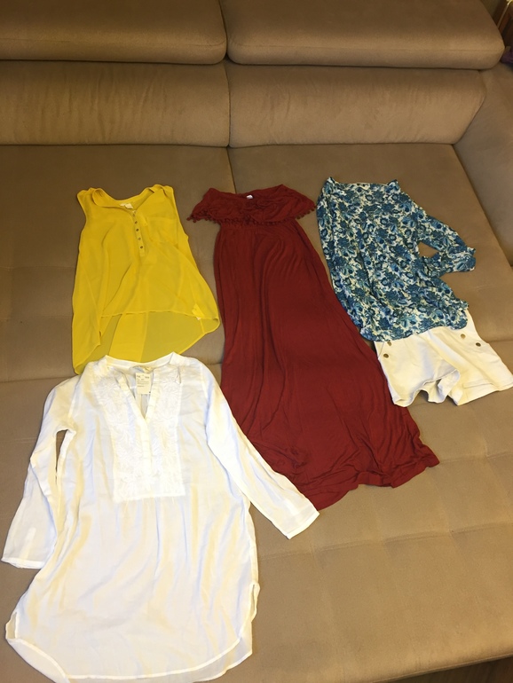 туника белая, рубашка с узором удлиненная, блузка желтая, длинное платье повседневное, шорты (плюс еще одни джинсовые).