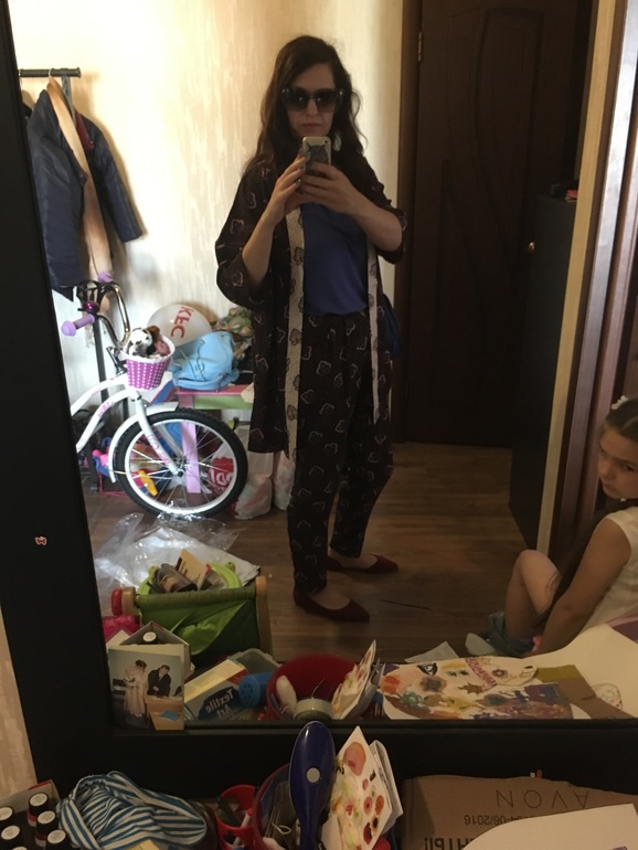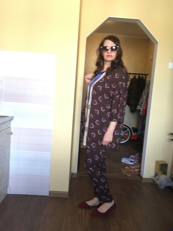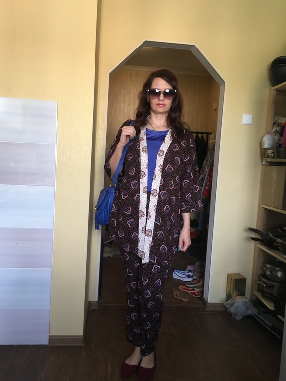 Нормальный костюм в пижамном стиле. Только поменяйте синий топ на белый (или того цвета, как лацканы жакета) шелковый и балетки на лодочки. Топ, желательно на тонких бретелях, чтобы поддержать тематику Вашего костюма. Вы стройны и красивы, кому, как не Вам носить такого рода модное сумасшествие!!! На самом деле, Вам хорошо. Соглашусь, не все могут и умеют такие вещи носить, а у Вас, мне кажется, получится! Удачи!