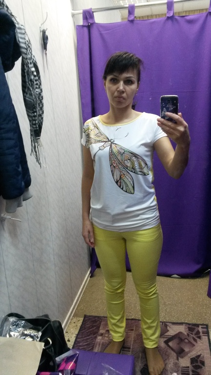 Если честно, то вас этот комплект не очень украшает. Белый кипельный на футболке не идет к лицу, брюки слишком обтягивают, создают ненужный рельеф. Талия спрятана, бедра не оч удачно обтянуты. Если по силуэту, мне думается, что у вас очень " платьево- юбочная" фигура. С тенденцией к приталенный формам и юбкам клеш.