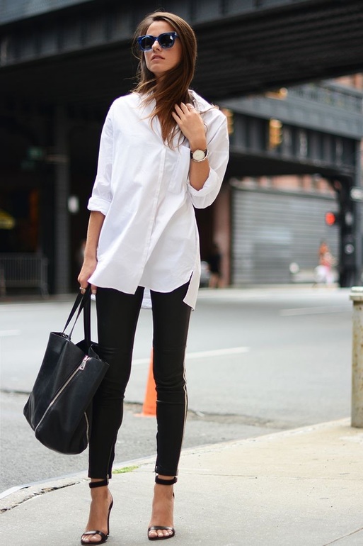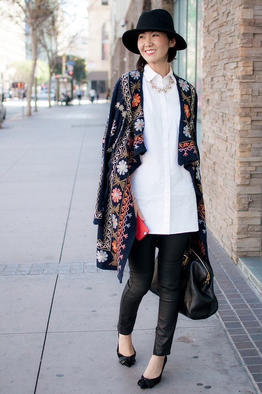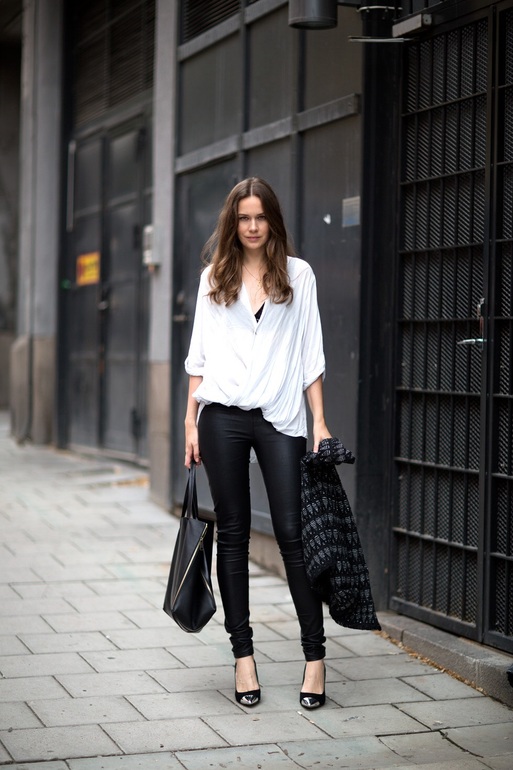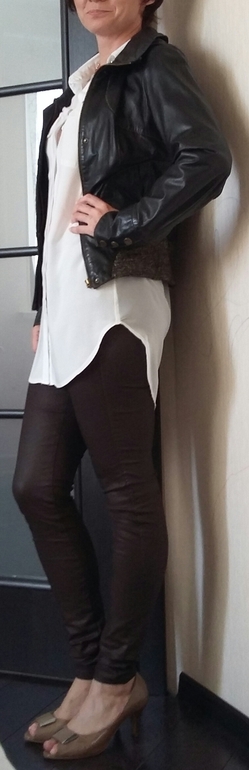 Не думала укоротить их немного? Обувь здесь либо яркая/контрастная, либо черная, мне кажется. Кожанку на стала бы так носить... Под низ можно или яркую или черную майку.