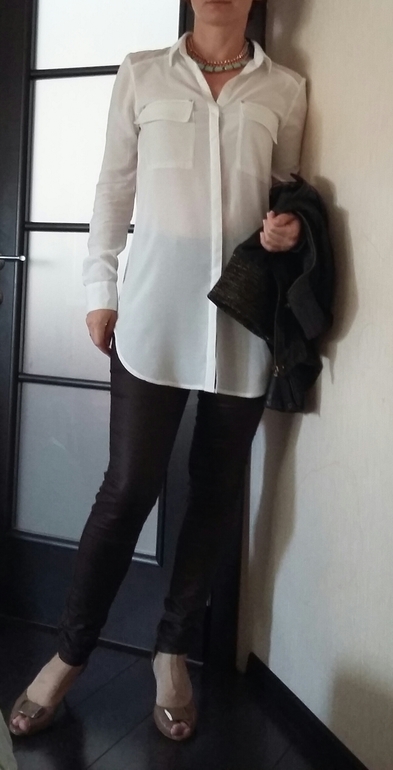 Марин, куртка явно не из этого ансамбля и туфли эти тоже. Попробуй под блузку топ и можно тогда будет ее расстегнуть (если блузка будет расстегнута, тогда к джинсам или брюкам нужен тоненький ремешок) и возможен вариант с узкими джинсами.