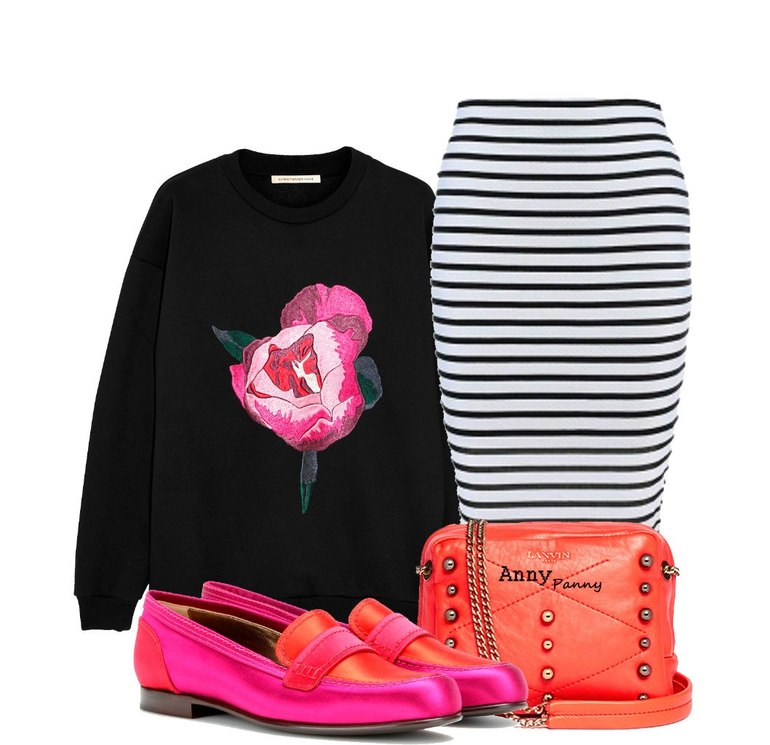 Мне больше нравится вариант однотонного верха под такую юбку. При чем можно попробовать и яркие цвета, и постельные тона!