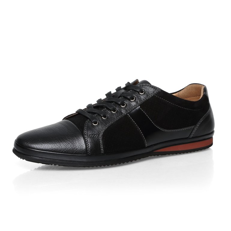 Ботинки а-ля кроссовки на шнурках черные, если на работу просто (под брюки и рубашку) и классические туфли если совещания и едет в костюме.