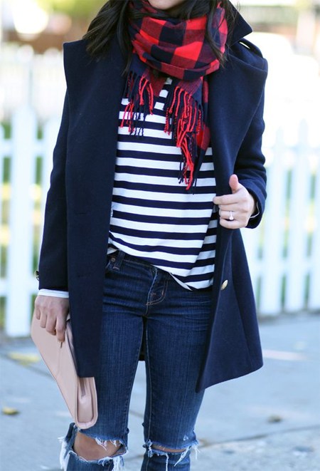 Платок с тельняшкой носят, у нас часто холодно и хочется укутаться. Просто расцветка должна быть комплиментарна. Клетка, морская тематика..