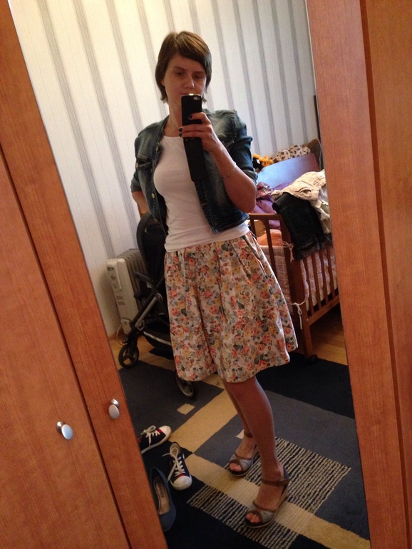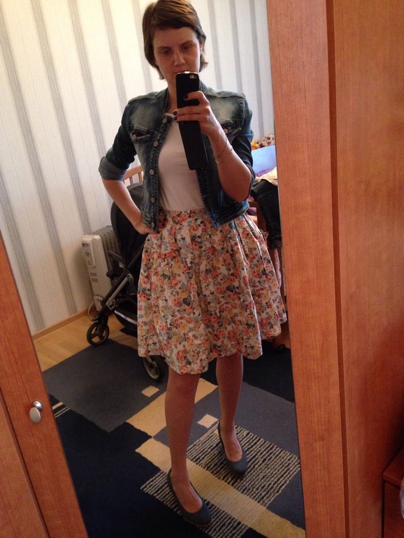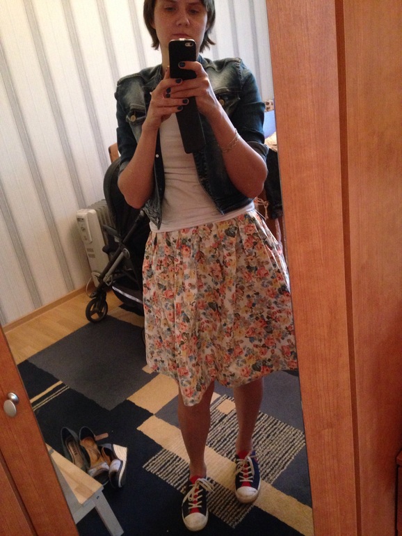 Вот тут мне кажется удачно вписались джинсовые туфли на пробке. И как раз не высокий каблук не смотрится недокаблуком.