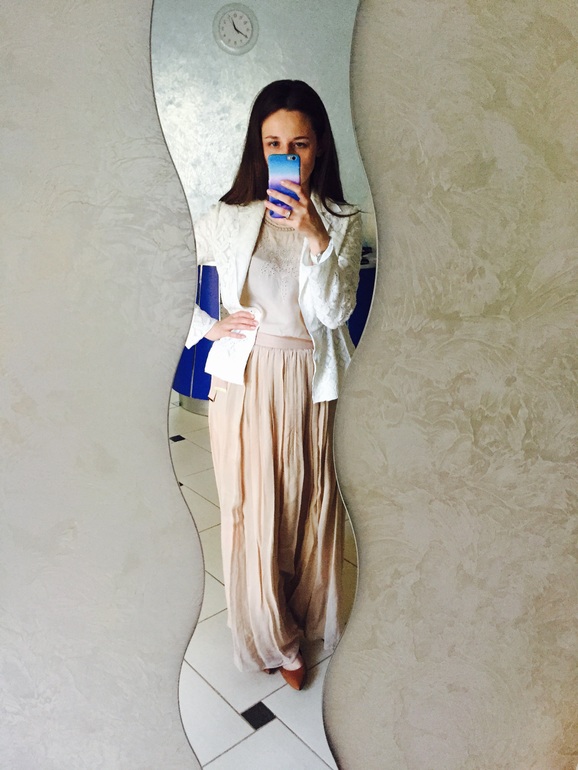 Сегодня ходили со старшим на собеседование в школу. Сказали, одеться прилично. Мы одели все лучшее сразу Юбки в пол ношу крайне редко-не умею, неудобно. Вот как раз выпал случай. Как вам образ