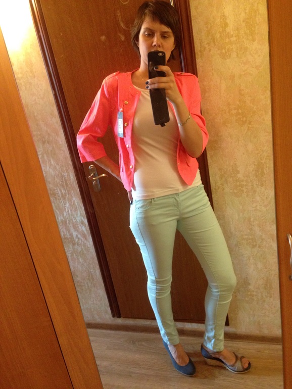 штаны мятные плохо сидят, плюс слишком яркий жакет перебивает лицо (возможно вообще не ваш цвет); но штаны можно попробовать с рубашкой свободной навыпуск и кедами