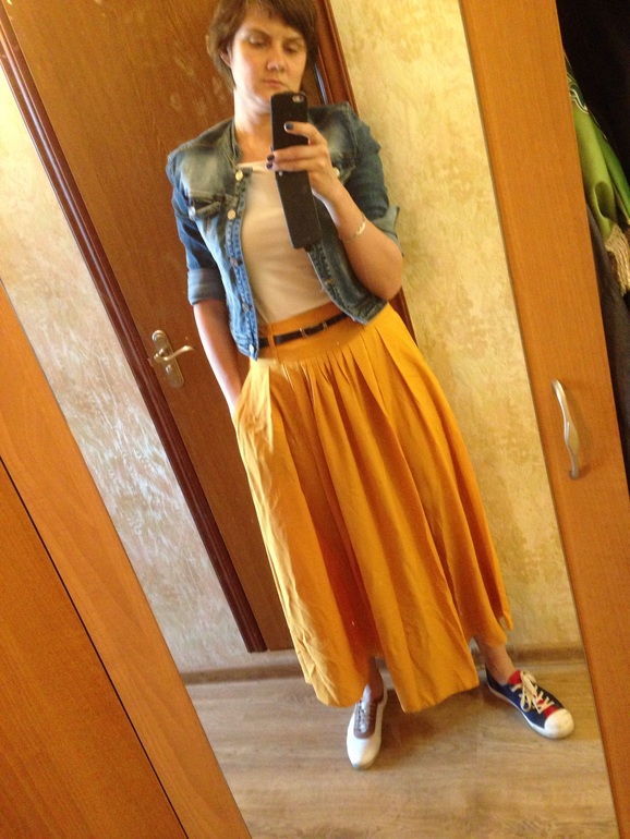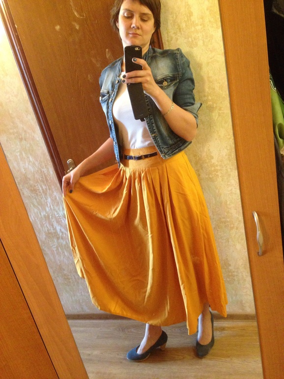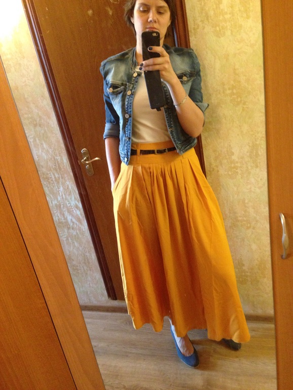 горчичную юбку я бы по колено обрезала, мне кажется будет луччше, и с босоножками; туфли тяжеловаты для тонкой ткани (вискоза же?) а если ее с тельняшкой?