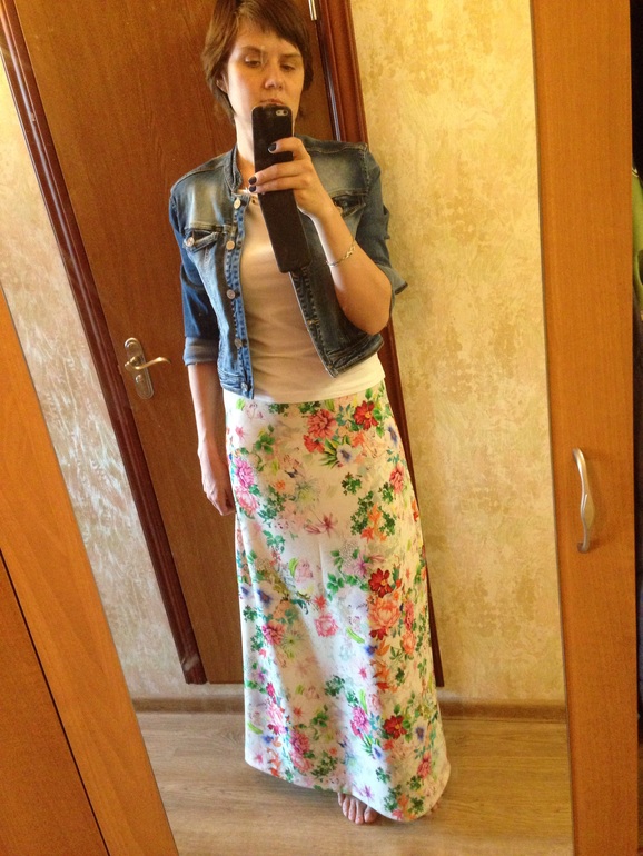 Цветочная юбка классная, и главное, сидит идеально, если вы ее шили на себя. Это огромный плюс) но не с трикотажем. И не навыпуск (так приземляется силуэт). Шифоновый светлый топ внутрь заправить, тонкий ремешок. Не с джинсовкой