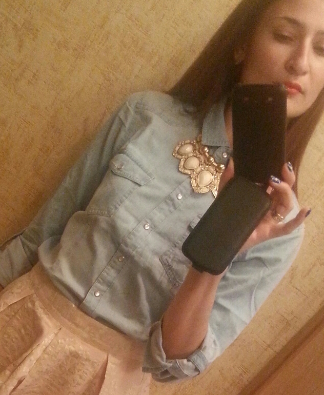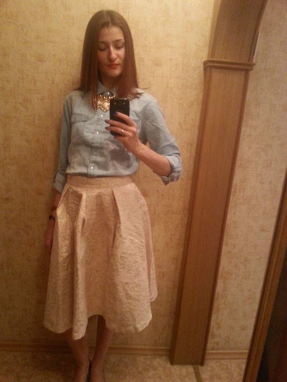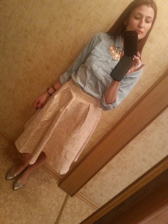 ПосоветуйтеДевочки, спрашивала у вас недавно,подойдет ли джинсовая рубашка под эту юбку.Купила вчера рубашку и колье и вот ,что получилось! Я осталась очень довольна)))А вам как?