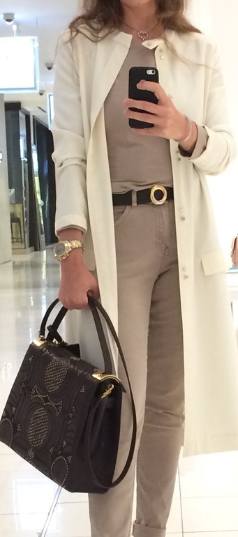 Комплект построен на простых линиях и кажется плодом непринужденного выбора. Но, если долго варишься в мире профессиональной моды, то видно, как тонко и профессионально все подобрано.