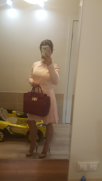 2. Розовый +сливово-бордобый. На туфлях подошва и каблук в тон сумки. Длинный рукав у платья больше по погоде, вроде, как и закрытые туфли.