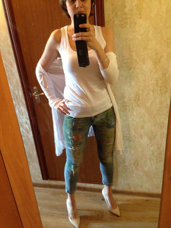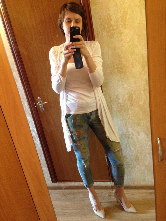 Оставить туфли, только верх другой, или этот попробуйте заправить в джинсы и не снимать Кардиган