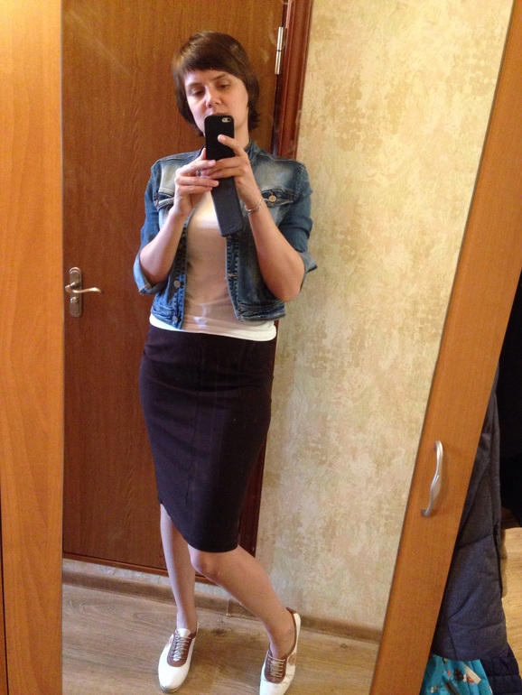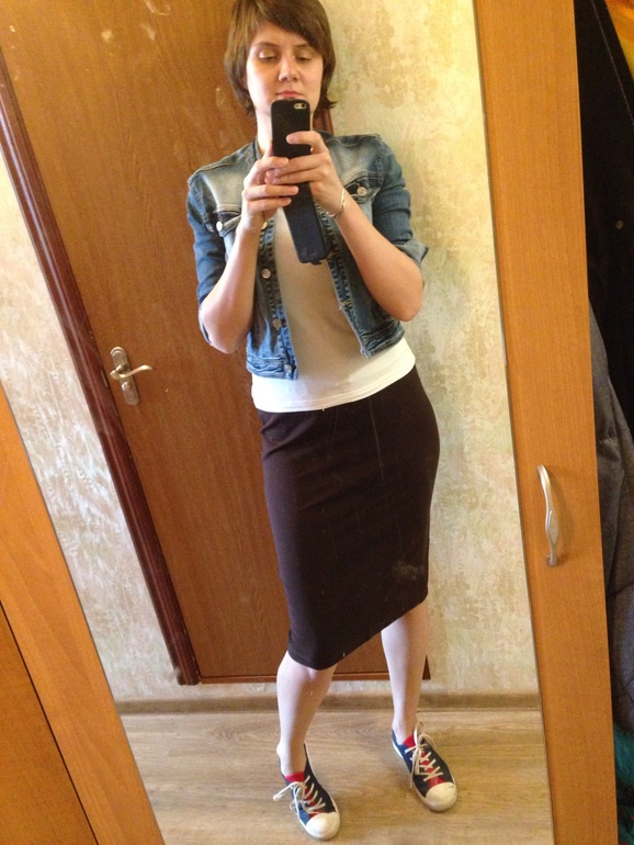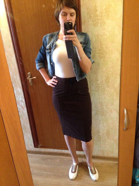 Юбка мне нравится. Не могла понять что к ней надеть. Хочу еще продумать осенне-весенний вариант с ней. Наверное надо какой-то свитер/свитшот и вот какую обувь не знаю.