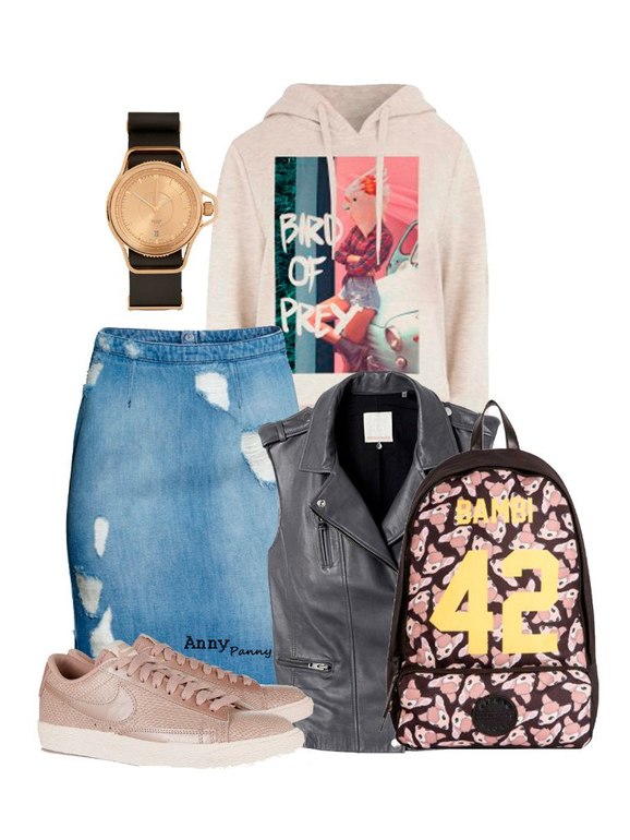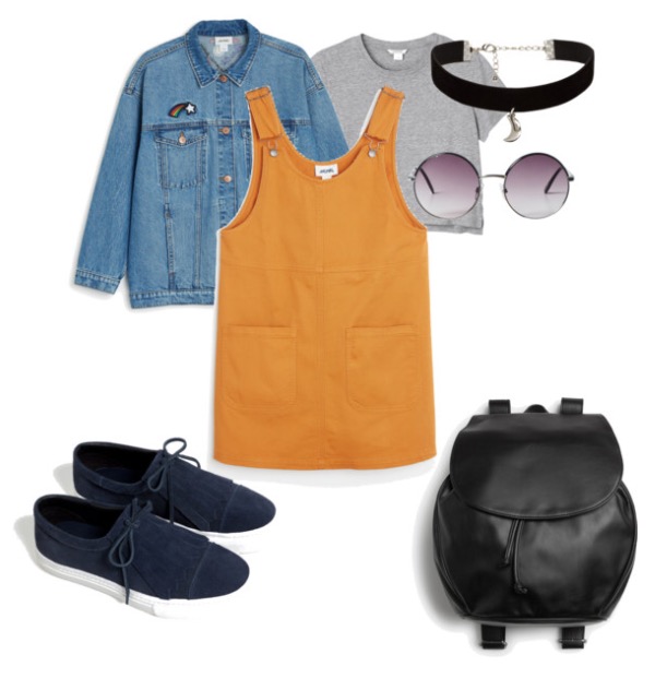 Monki. Я бы выбрала платье выше колен, джинсовку, кеды, рюкзак. Платье либо на толстых лямках под однотонную футболку, либо оверсайз