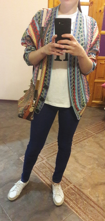 По поводу второго образа, сумку выбрала бы однотонную и футболку тоже. Все внимание на себя перетягивает ваш интересный кардиган. А поближе нам его покажите пож-та.