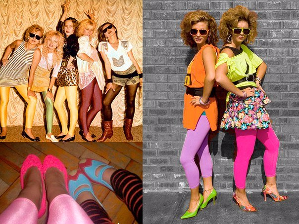 Прическа на мелкие бигуди, штаны-бананы, подплечники, цветные колготки и колготки с рисунком, пластиковые браслеты...