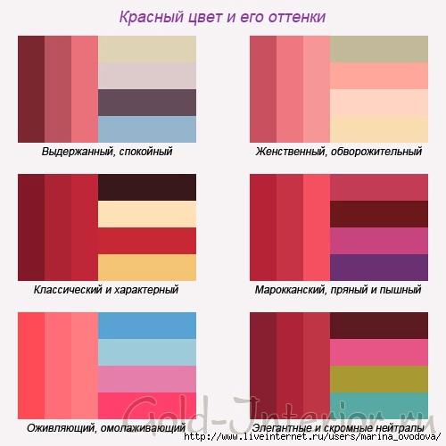 Вообще вам нужно правильно "опознать" ваш оттенок красного и потом смотреть по палеткам