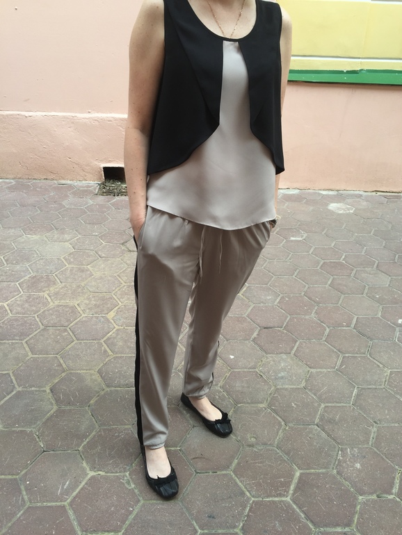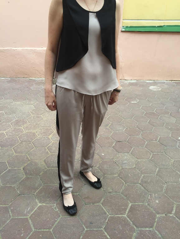Каблук с утра не смогла найти(( хотела с черными туфлями. А лампасы сейчас вроде в тренде. Но у нас кто во что горазд: сарафаны полупрозрачные, мини и т.д.