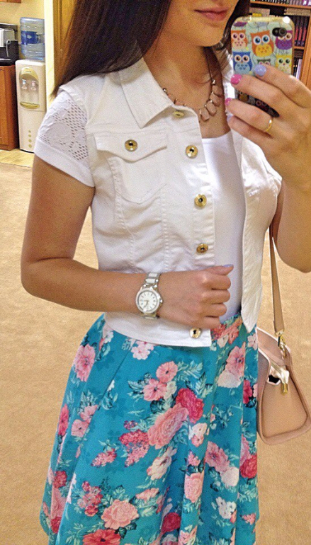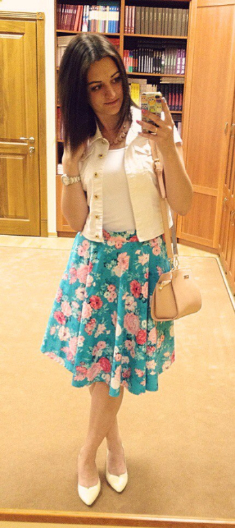 Под юбку надела футболочку обычную белую, с кружевными рукавами и спиной. Но спину прикрыла джинсовой жилеточкой ) Вот тут рукавчики видно (и колье, под цвет сумки оно):