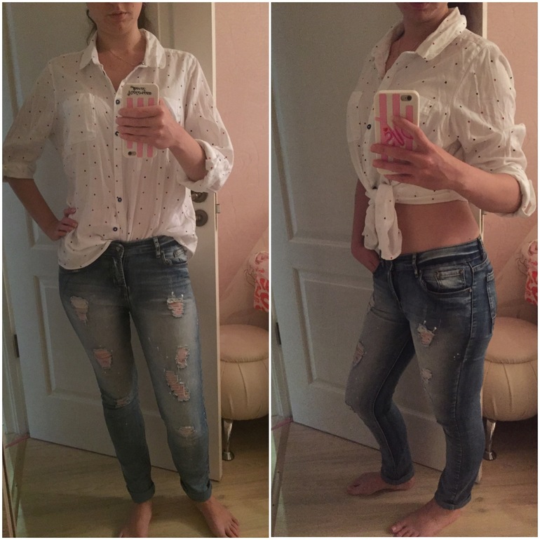 Узлом нет, т.к. сразу увеличивает бёдра. В людные места под узел надевай обычную однотонную маечку в обтяг, длиной ниже пояса брюк, и сверху рубашку узлом. Вообще, мне не нравится, как на тебе эти рубашка и джинсы. Сели по фигуре, но это не твоё. У тебя свой особенный стиль, старайся больше его подчёркивать, чем просто в модную струю уходить. M&S понравился комплект - ты сразу ярче стала, и фигуру отлично подчеркнул!
