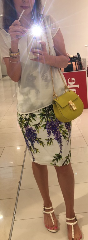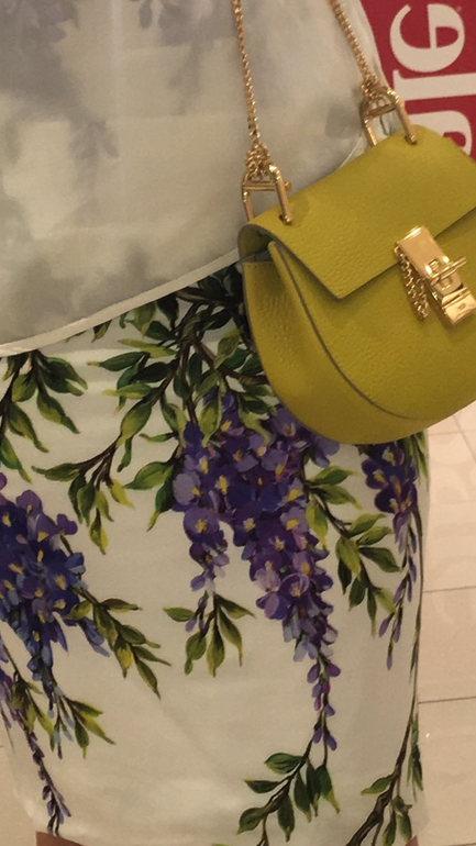 Я взяла эту сумочку сама не зная почему. Цвет такой сложный. Какой то миллионный оттенок зеленого. И только дома рассмотрела, что на узоре платья , на самых кончиках листьев есть точно такой же оттенок😂😂😂😂