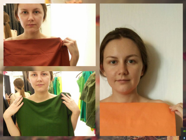 Мы сделали более 70 фотографий, здесь я выложу только самые показательные. Вообще в профессиональном наборе для драпинга из тканей по колоритам более 150 оттенков, для новичков идет упрощенный набор из 100 тканей. Поэтому как можно по одной-двум фотографиям определить сразу колорит, для меня загадка.