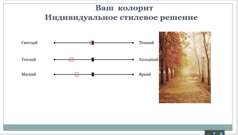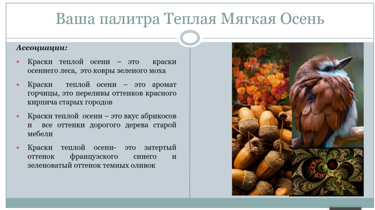 Мы по фото попробовали подобраться оттенки, которые указывают на Теплую Осень.