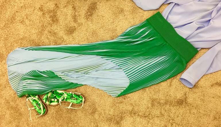 Люблю эту юбку. За роскошное сочетание зеленого и лилового.За мелкое плиссе, на мой взгляд оно изящнее крупного.
