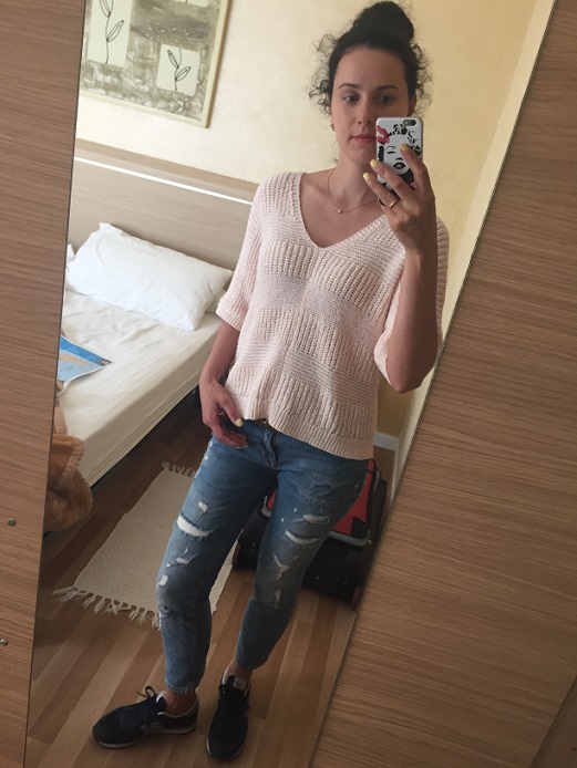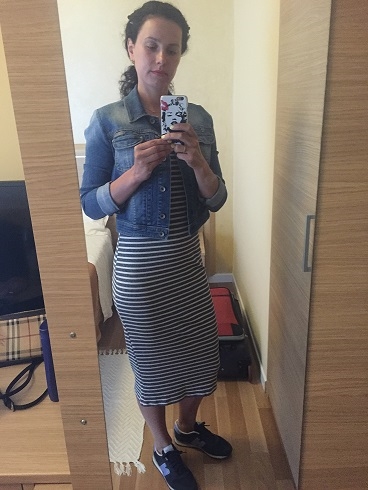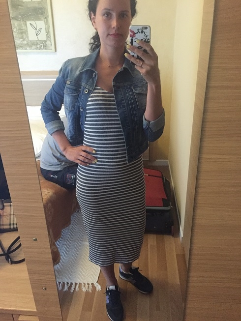 есть у меня такое платье...все в обтяг и как майка сверху:) ..подруга посоветовала купить...поддалась..хотя я не ношу такие вещи, для меня слишком открытый верх и сильно в отбяг живот не позволяет носить:) (на фото я в коррекционном белье) но было принято решение дополнить свитерком..с ним мне комфортно! с джинсовкой тоже вроде норм..? и наверное больше подойдут сюда кеды чем кроссовки?