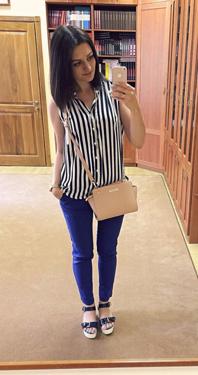 Мне вот именно такая полоска обычно не нравится ,а твоя блузочка суперская! а как на тебе брючки сидят ммм ...))а сережки такие нежные.