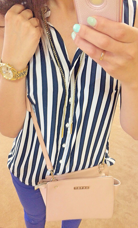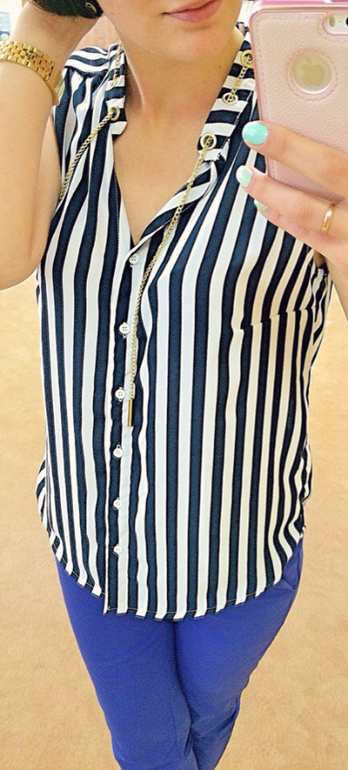 Купила вчера тонюсенькую блузочку, как раз на такую жару. В продольную полоску + золотая фурнитура на вороте.