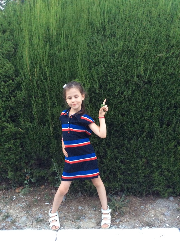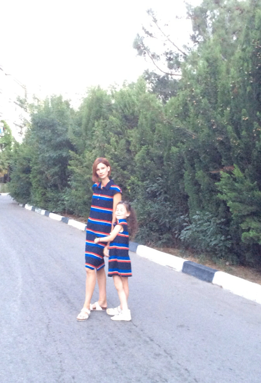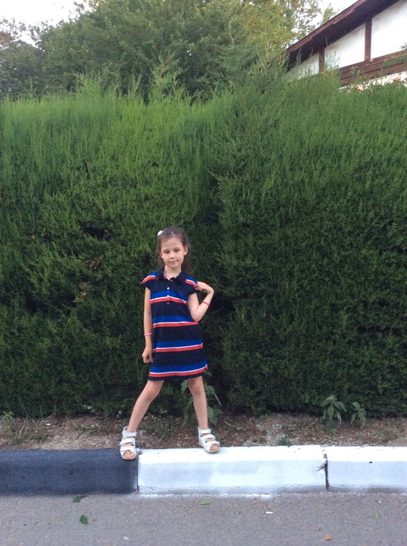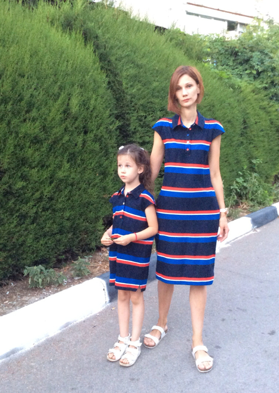 На прогулкеВ одном из постов спрашивала совета, что сшить из плотного трикотажа. В итоге сшила платье-поло. Ткани было много, поэтому такое же точно платье получила и дочка)).