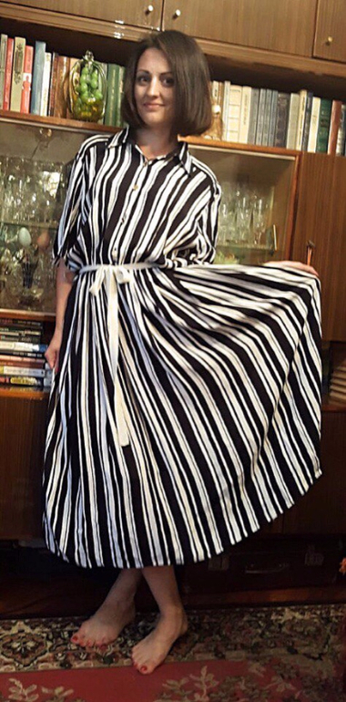 Полосатое платье эффектно смотрится. Я бы немного ушила по фигуре в верхней части платья и укоротила рукава сантиметров на 7-10. Так мне кажется у платья будет более спортивный стиль. Но это мое ИМХО.