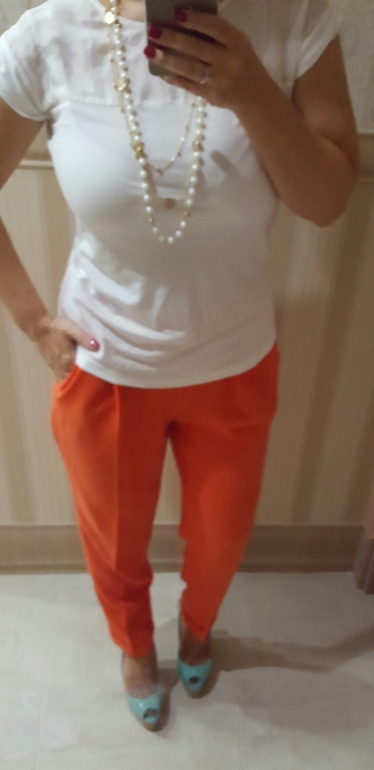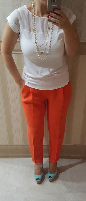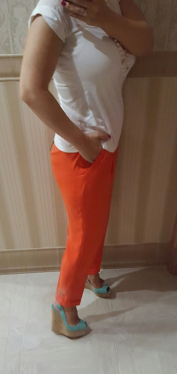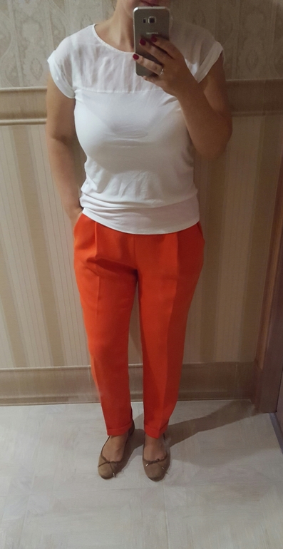 Спасибо! Он немного интереснее чем просто оранжевый. Муж сказал ярко коралловый. Фото конечно же не передает)) попа у меня тож не маленькая) просто видимо грудь на фотках еще больше😂 кстати брюки взяла больше на размер и в талии великоваты. Пойду съем пирожок)