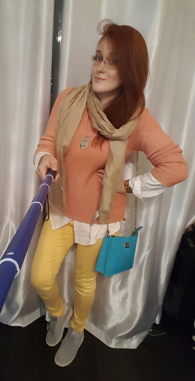 Я бы желтые штанишки заменила на беж,а то нестыковочка низа с верхом)))Бирюза с лососем дружат)))Очки Вам очень идут