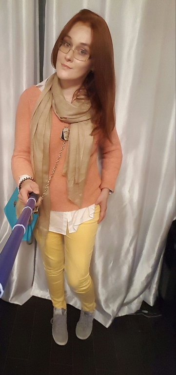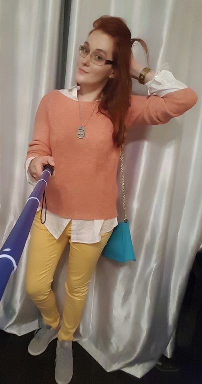 Как жизнерадостно получилось. Тоже нежно люблю массимо. Но по мне бы сюда шарфик под обувь, тем более недавно вроде в Ютер несколько штук было куплено ) А брюки с джемпером прямо отлично сочетаются.