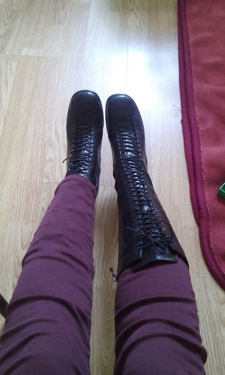 А мне нравятся. Глянуть бы еще на ноге сбоку, а то так как то не понятно. Их хорошо было бы под юбку, которая сантиметров на 5 короче, чем сапоги, я думаю... Юбку я бы попробовала и пышную (чтобы в целом барышня вышла) и карандаш (тогда еще б удлиненный жилет и брутальный ремень на талию)... Это я так, фантазирую...