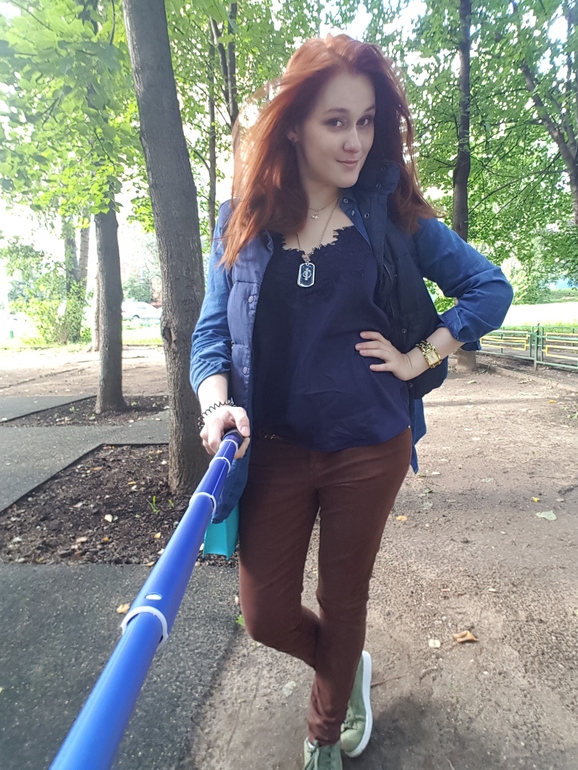 цвет брюк явно гармонирует с цветом волос ))) а синий все это разбавляет )))