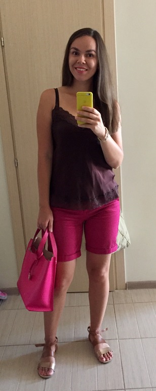 Мне не очень нравится. И дело даже не в полнящих или нет шортах, а именно сочетание шорт и топа. Ни цветом ни фасоном. Они из разных опер. Сюда белое поло и уже будет другая история. Или топ из хлопка с американской проймой. Но с этим топом что-то нет