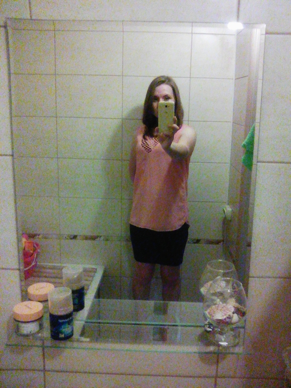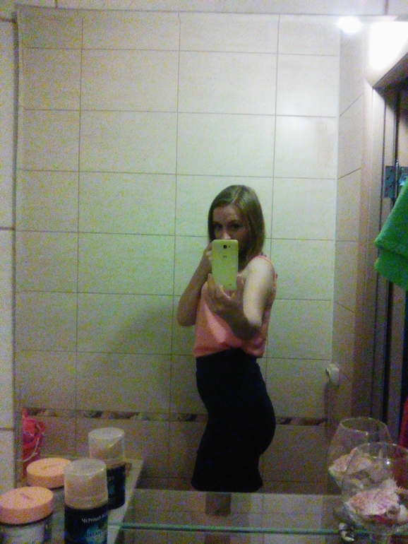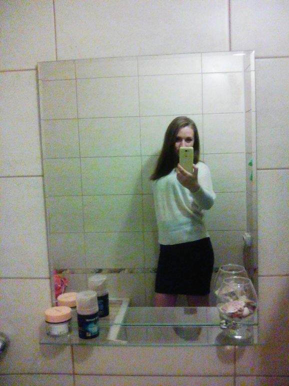 Юбка Вам не мала? Кажется,что должна сесть по бедрам ниже...И сзади торчит.Кофта вторая смотрится лучше по фасону,но смущает ее полупрозрачность