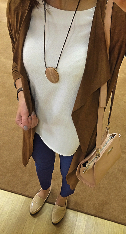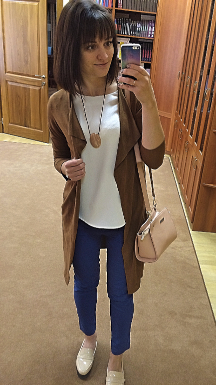 Сегодня я в замшевом кардигане. У него есть дурацкая особенность - он прилипает к штанам натуральной ткани )) А к синтетике (или примеси) - нет! ))) Поэтому нужно искать что-то не только подходящее по цвету/модели, но и по материалу (( А жаль (((