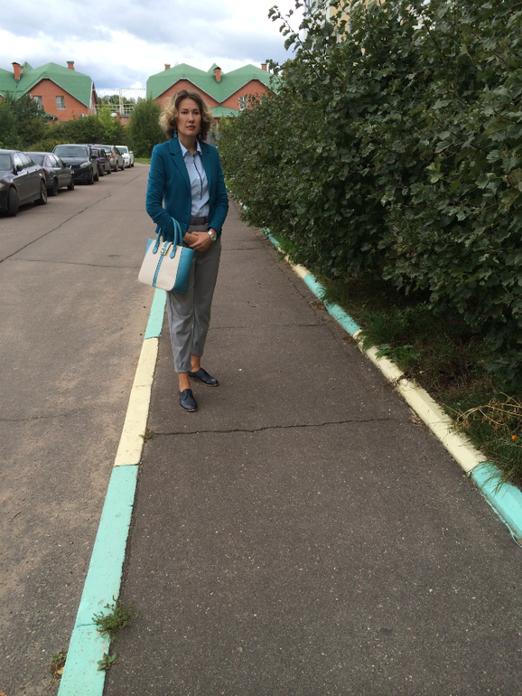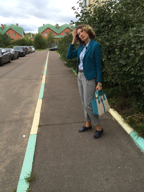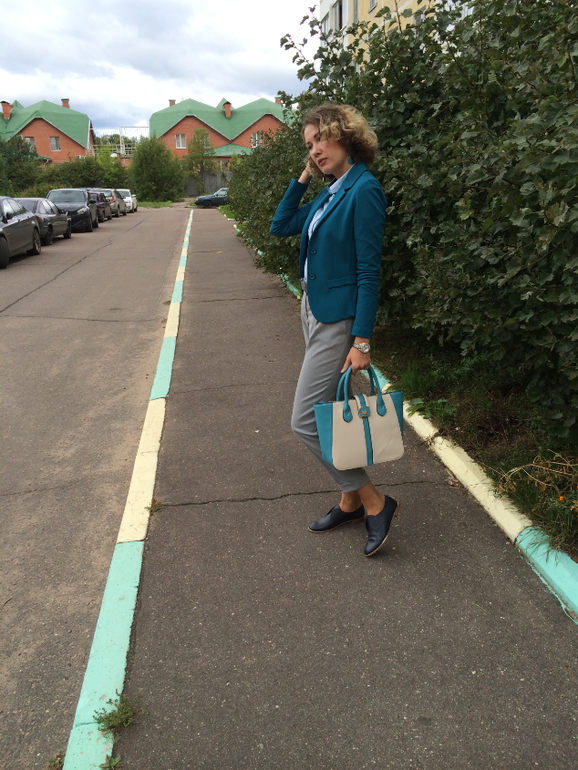 Погода не очень радует, прохладно,а как хочется тепло. Я сегодня в брюках и жакете, без каблука,слишком много ходила, на каблуке не смогла бы.Вещи все уже не первый раз одевала, но в этом ансамбле первый раз