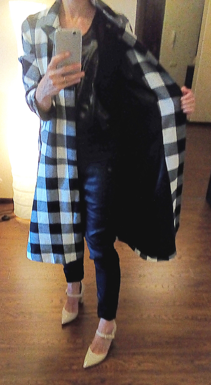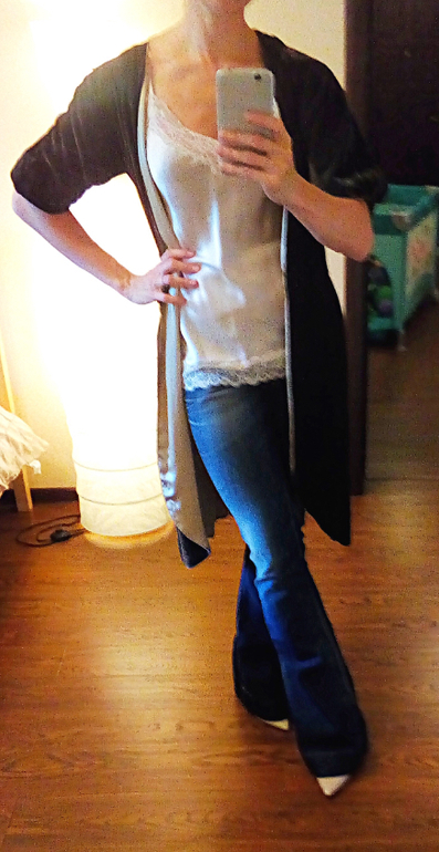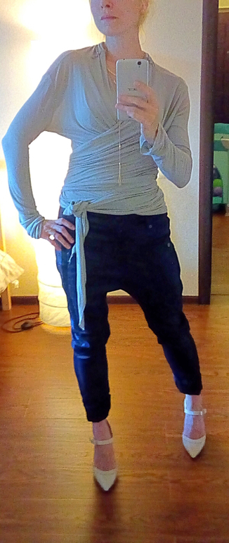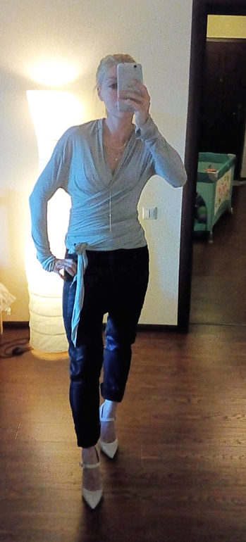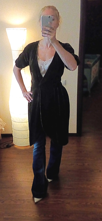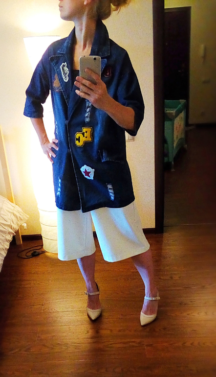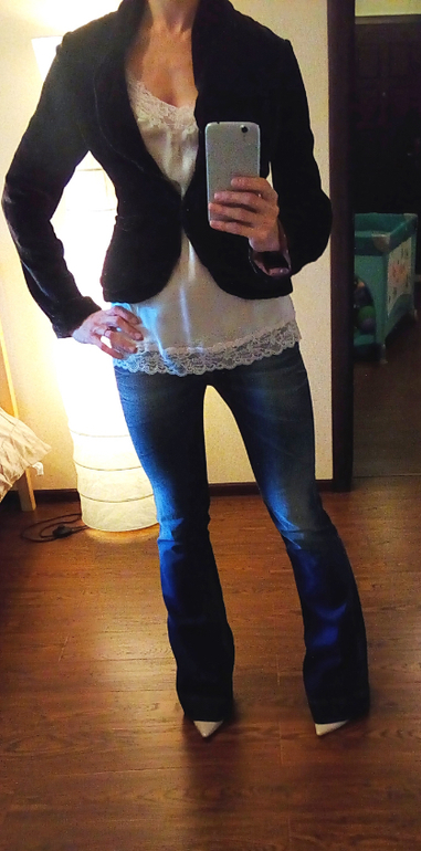 Вариант с коротким жакетом лучше бы смотрелся, если топ заправить в джинсы, но у меня сейчас послеоперационный двухслойный бандаж, поэтому не заправляла.