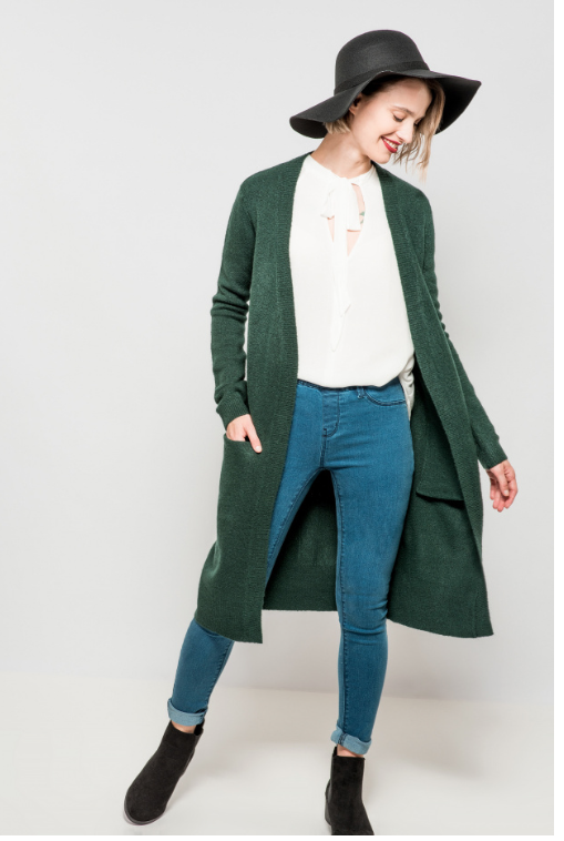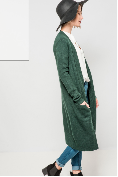 купили мы вот такой кардиган бутылочного цвета. Вернее, примерили в Бифри, а заказали на ВБ через Наргиз с 43% скидкой.
