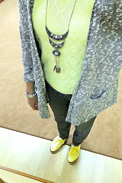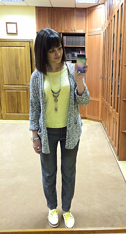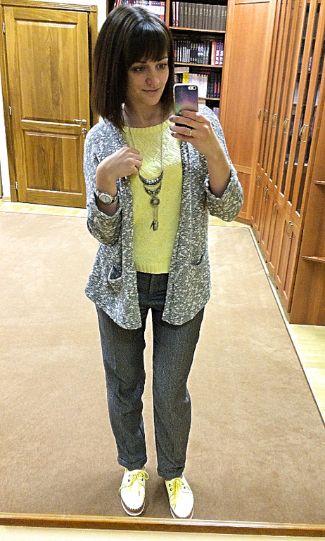 Сочетание цвета прекрасно. Но слишком много фактуры. Здесь и ''букле'' кардигана, и ''елочка'' на брючках, и рисунок на джемпере, и многоцветье ботинок.